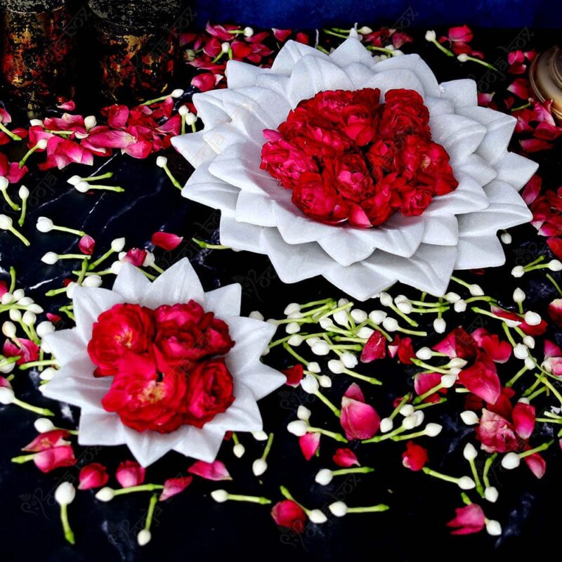 Premium Marble Lotus Urli Set of 3 – Polished Finish Decorative Urli (6, 9 & 12 Inch) | White Marble Flower Urli for Home Decor & Gifting